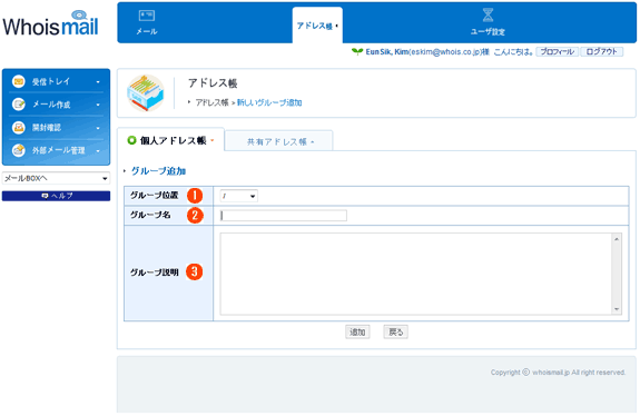 ① グループ位置 : グループを追加する位置を選択します。 ② グループ名 : 新しく追加するグループ名を入力します。 ③ グループの説明 : 新しく追加するグループについて説明を簡単に入力することができます。